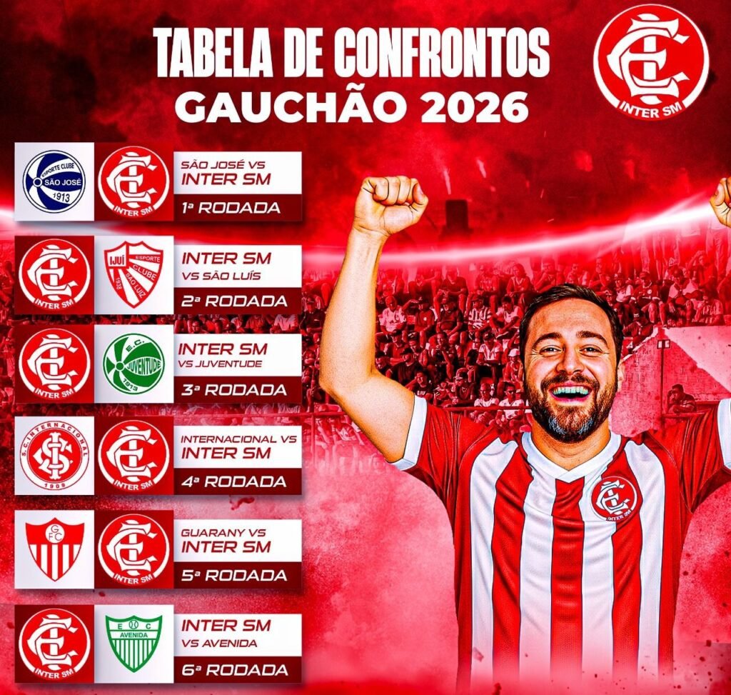 O Inter-SM já sabe quem enfrentará na primeira fase do Campeonato Gaúcho de 2026. O sorteio, realizado na última segunda-feira, 10 de novembro, pela Federação Gaúcha de Futebol, colocou o Alvirrubro no Grupo B, ao lado de Grêmio, Caxias, Novo Hamburgo, Monsoon e Ypiranga de Erechim.Os adversários da etapa inicial serão os clubes do Grupo […]