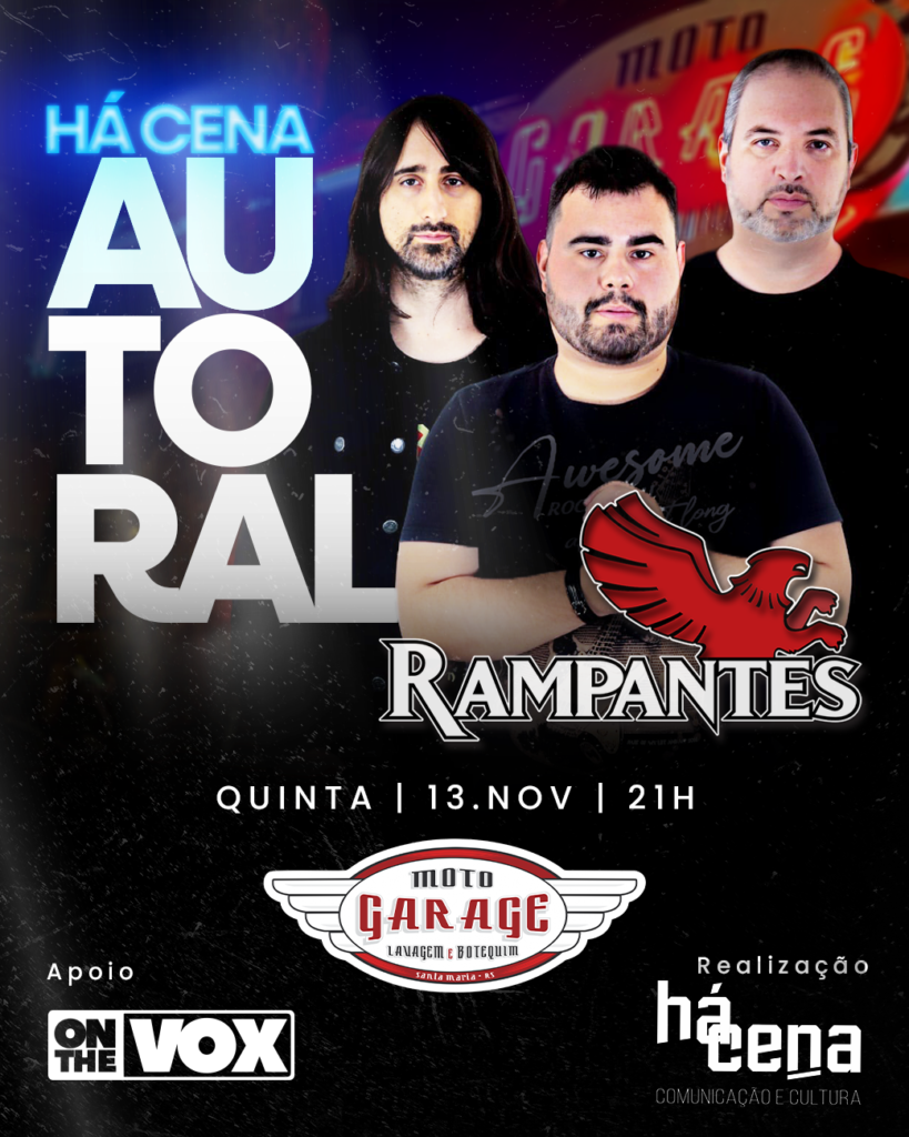 O projeto Há Cena Autoral realiza sua segunda edição no Moto Garage, em Santa Maria, recebendo a banda Rampantes, apresentando suas composições marcadas pela energia e por melodias bem trabalhadas, tanto nas linhas vocais quanto nos solos de guitarra. O evento acontece na quinta-feira, 13 de novembro, às 21h, com ingressos a R$ 15, vendidos somente na hora.