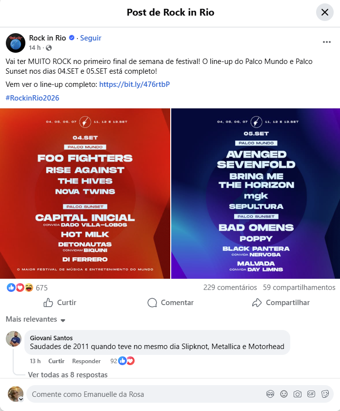 Consolidado como um dos maiores festivais de música do planeta, o Rock in Rio aposta em uma combinação de grandes atrações, tecnologia e experiências interativas para manter o alto nível de entretenimento que marca sua trajetória.